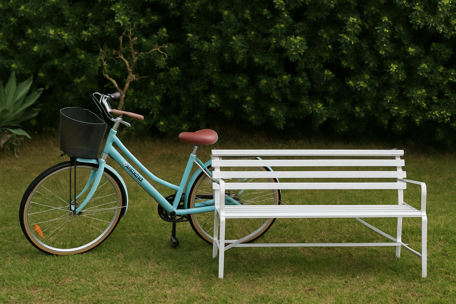 Vintage Light Blue Bike + White Metal Bench – Outdoor Pair